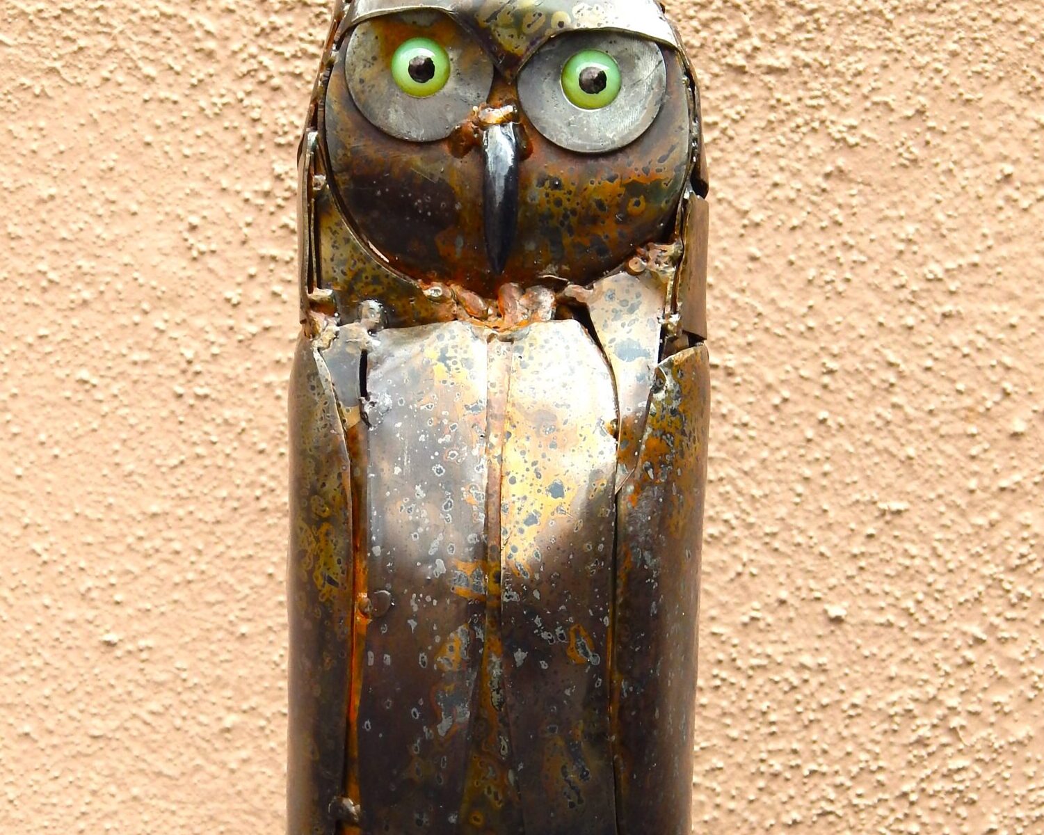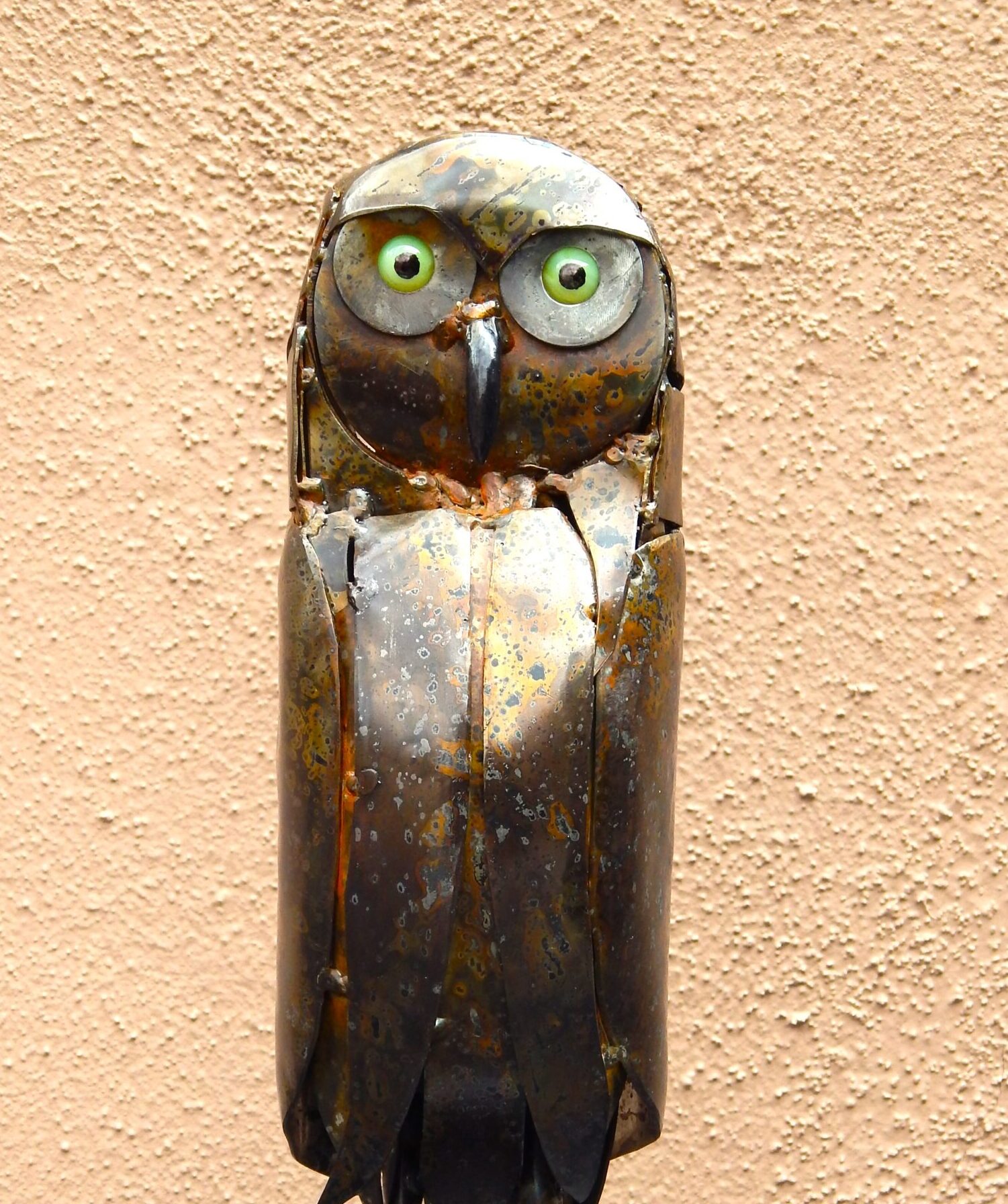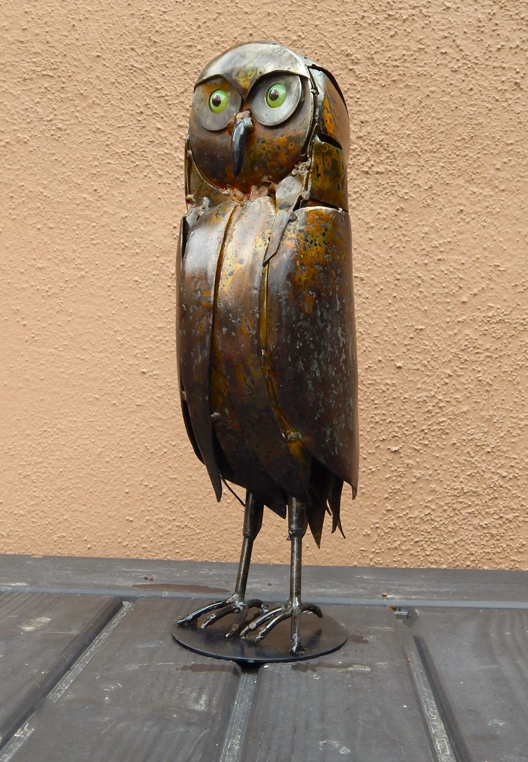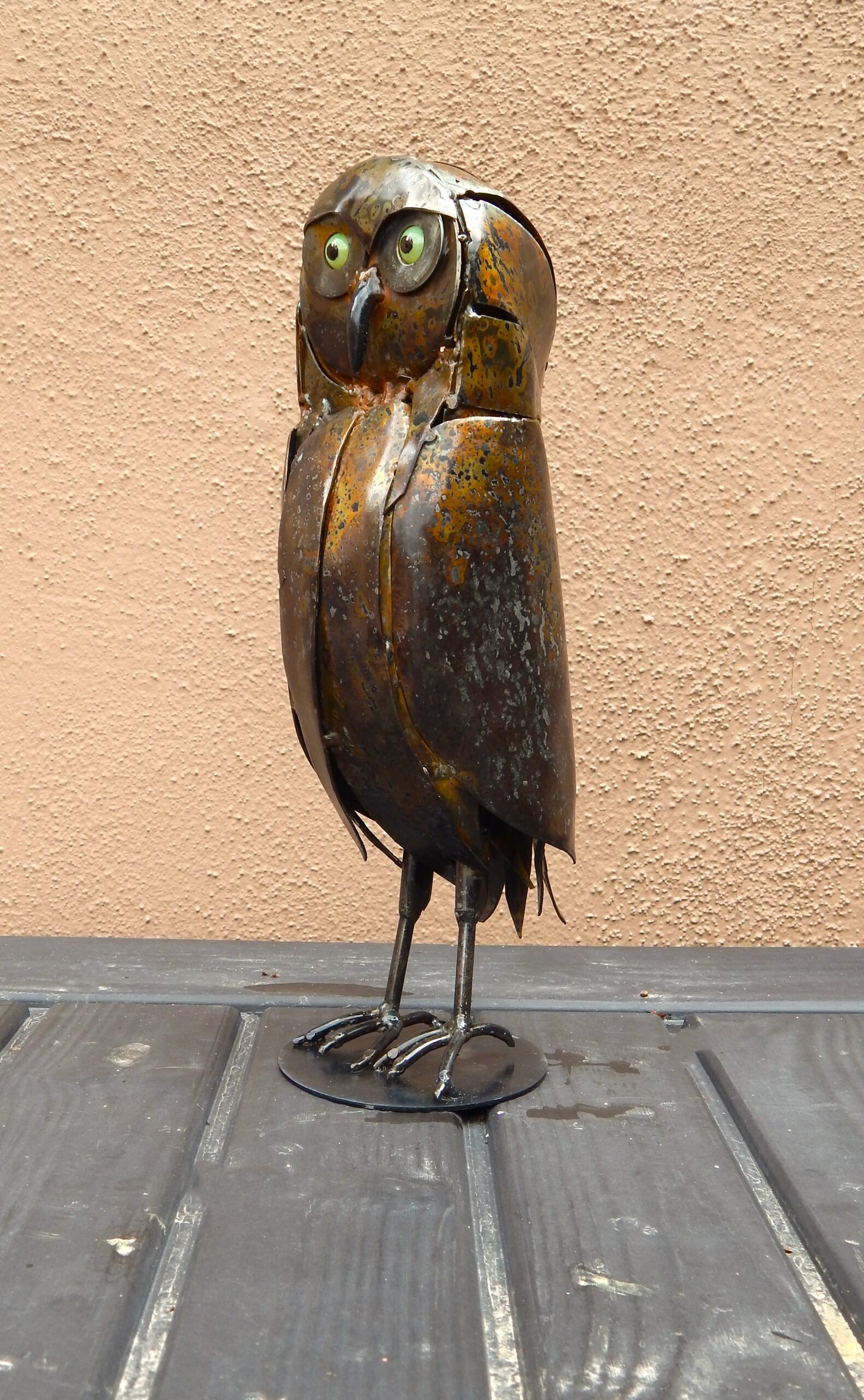 Handmade, welded steel burrowing owl on steel plate base.
