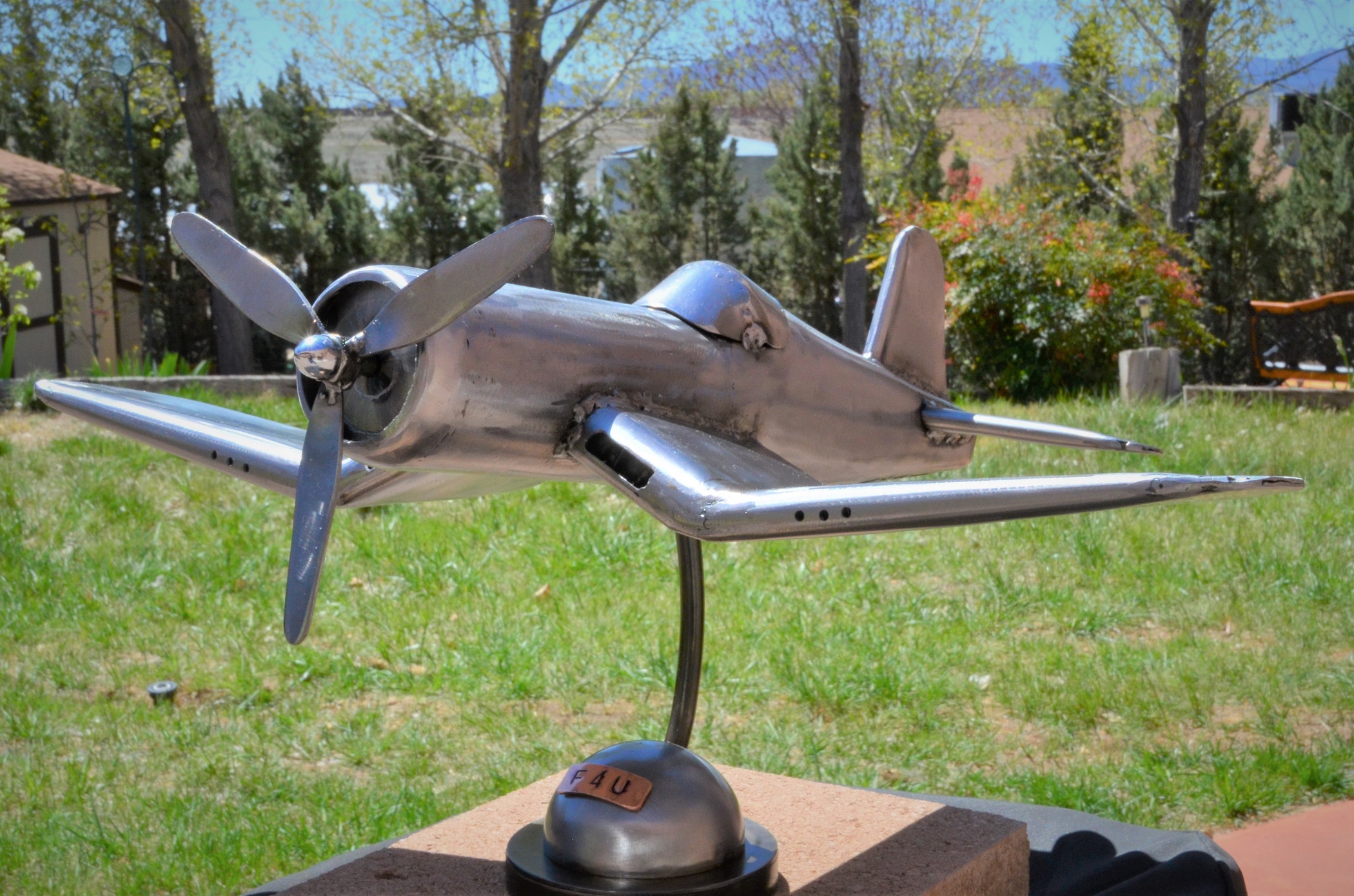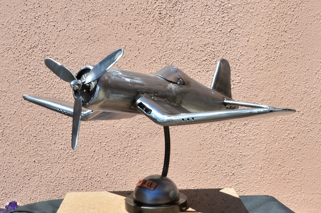 All steel, welded F4U Corsair fighter plane with metal display stand.