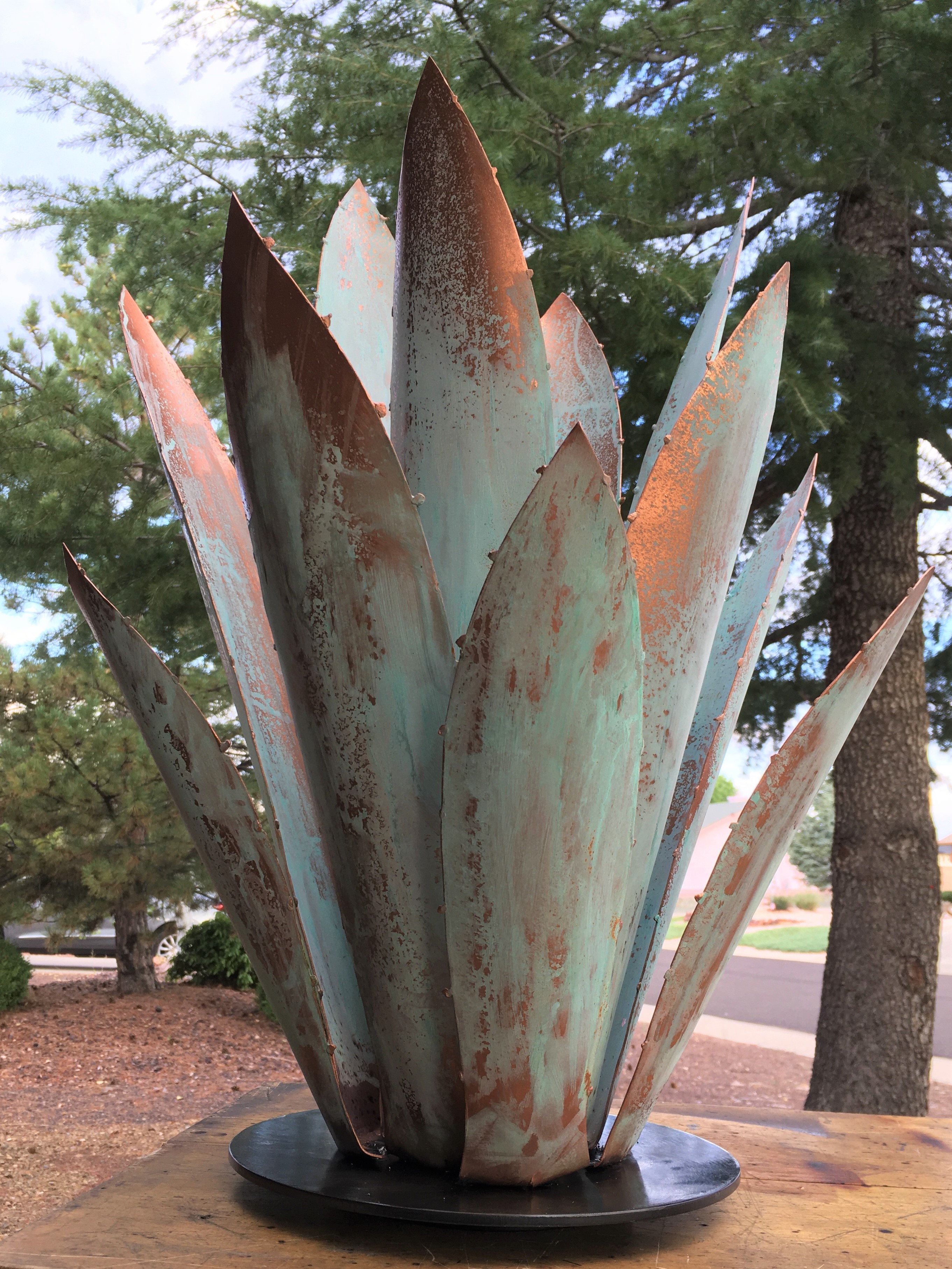 This is a welded all steel Agave plant sculpture with aged copper finish.